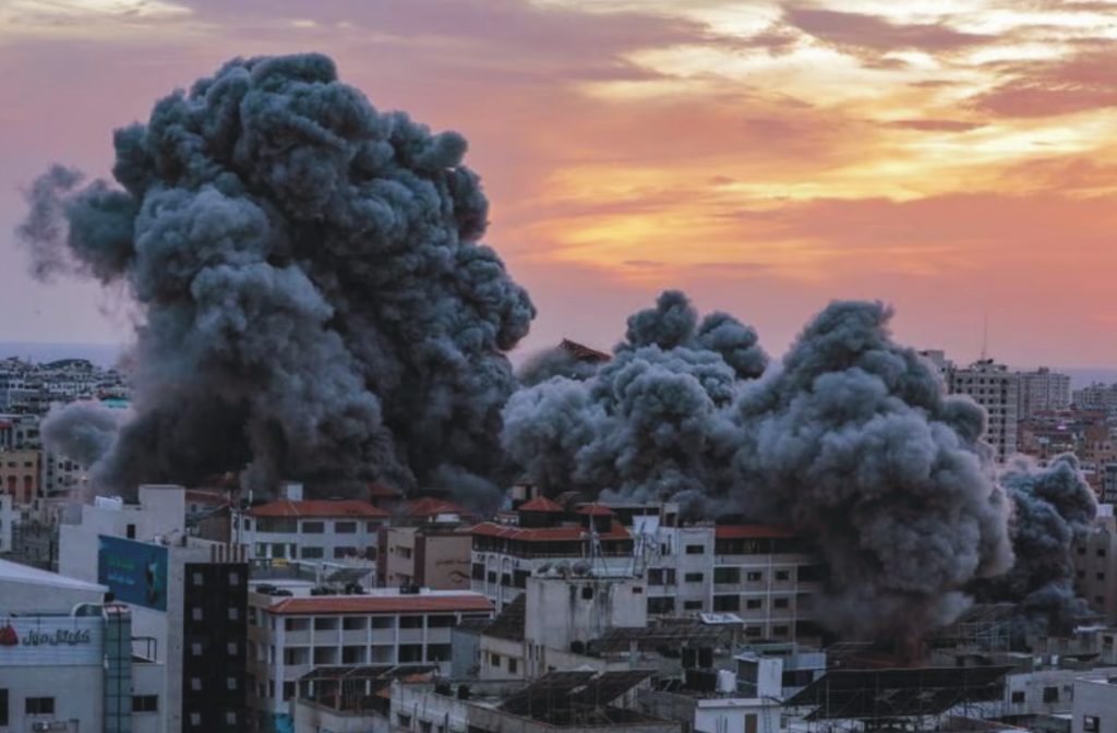 Smoke and flames billow after Israeli forces struck a high-rise tower in Gaza City, October 7. REUTERS/Ashraf Amra