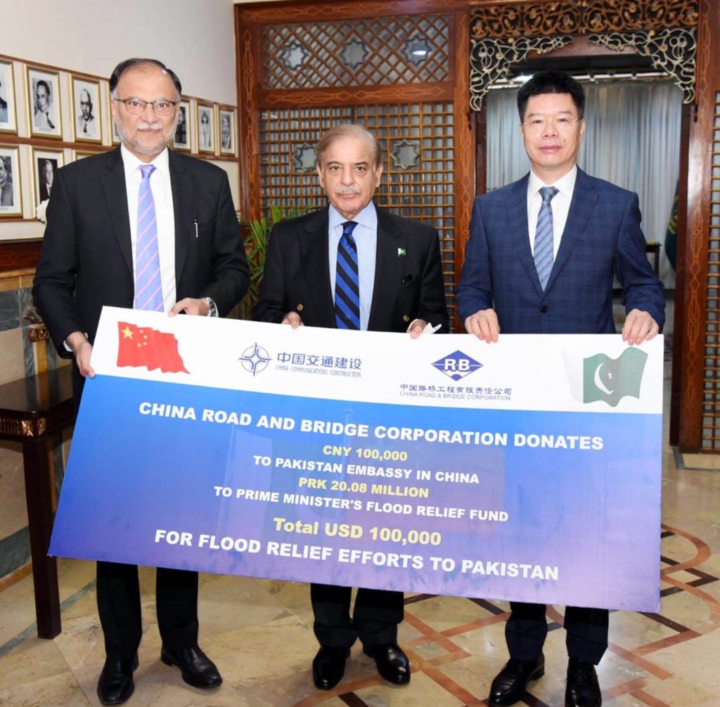 Vice President China Road and Bridge Corporation, Mr Ye Chengyin presents a cheque of US $100,000 to Pakistan Prime Minister Shehbaz Sharif for PM’s Flood Relief Fund in Islamabad.