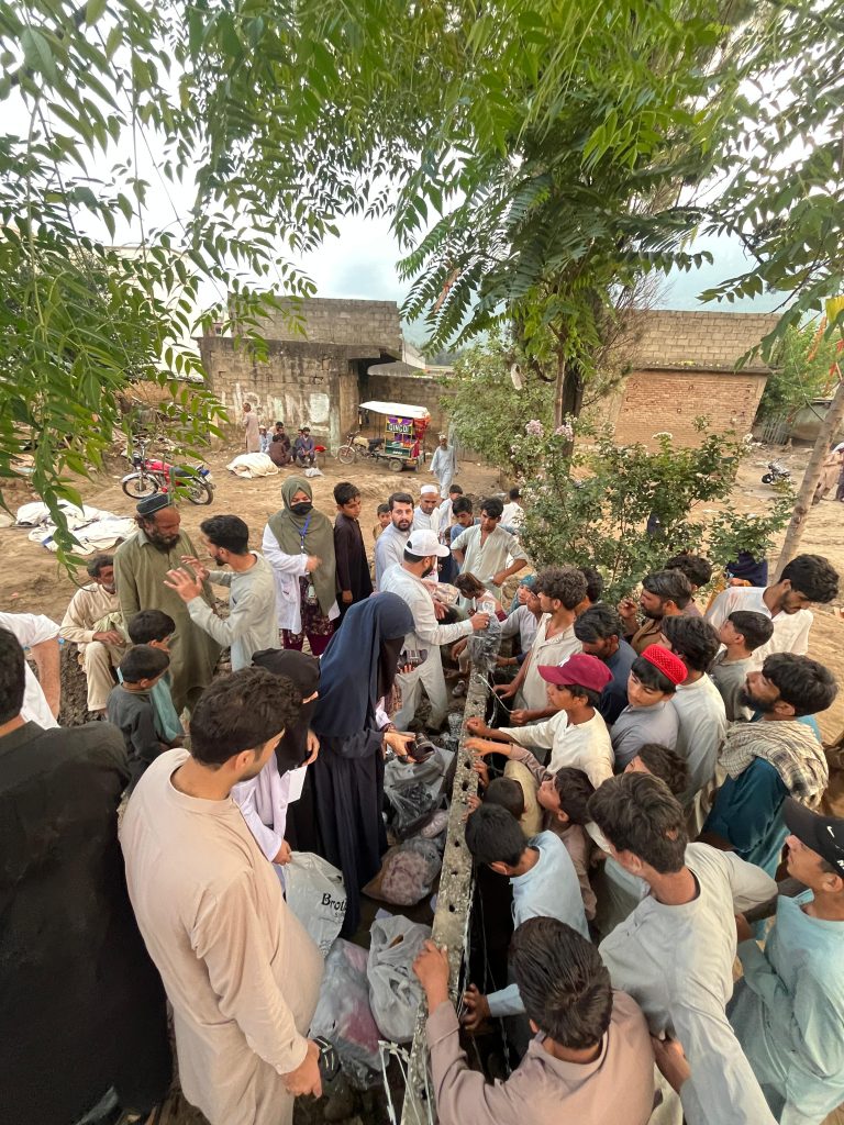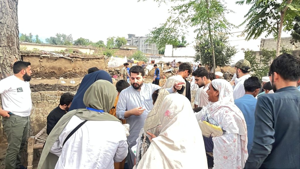 Helping Humanity Organization (HHO) volunteers and supporters distribute relief items and clothes among flood affectees in the worst-hit Pir Baba locality of Buner district. – Bulletin Photo